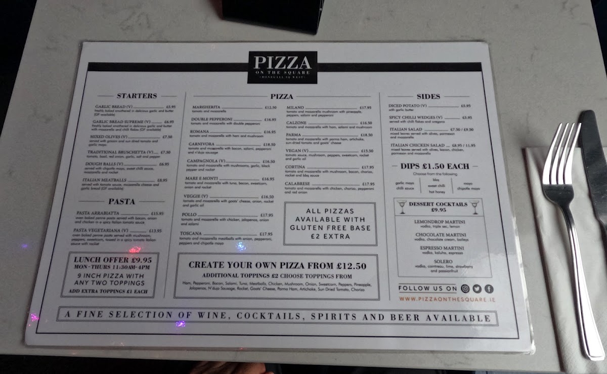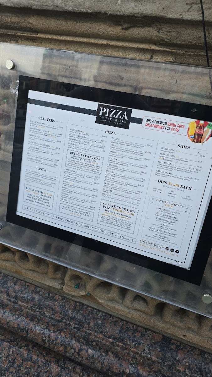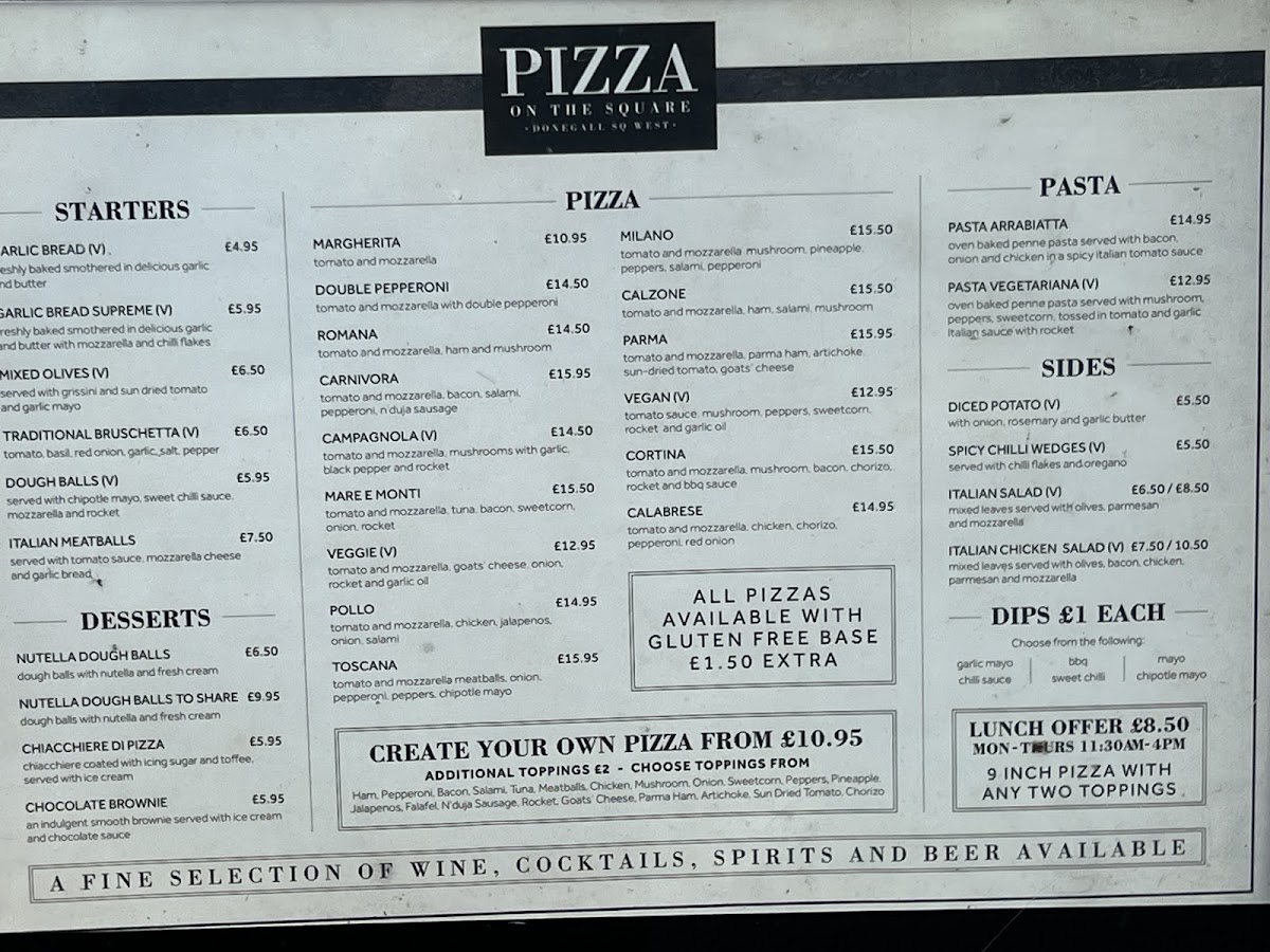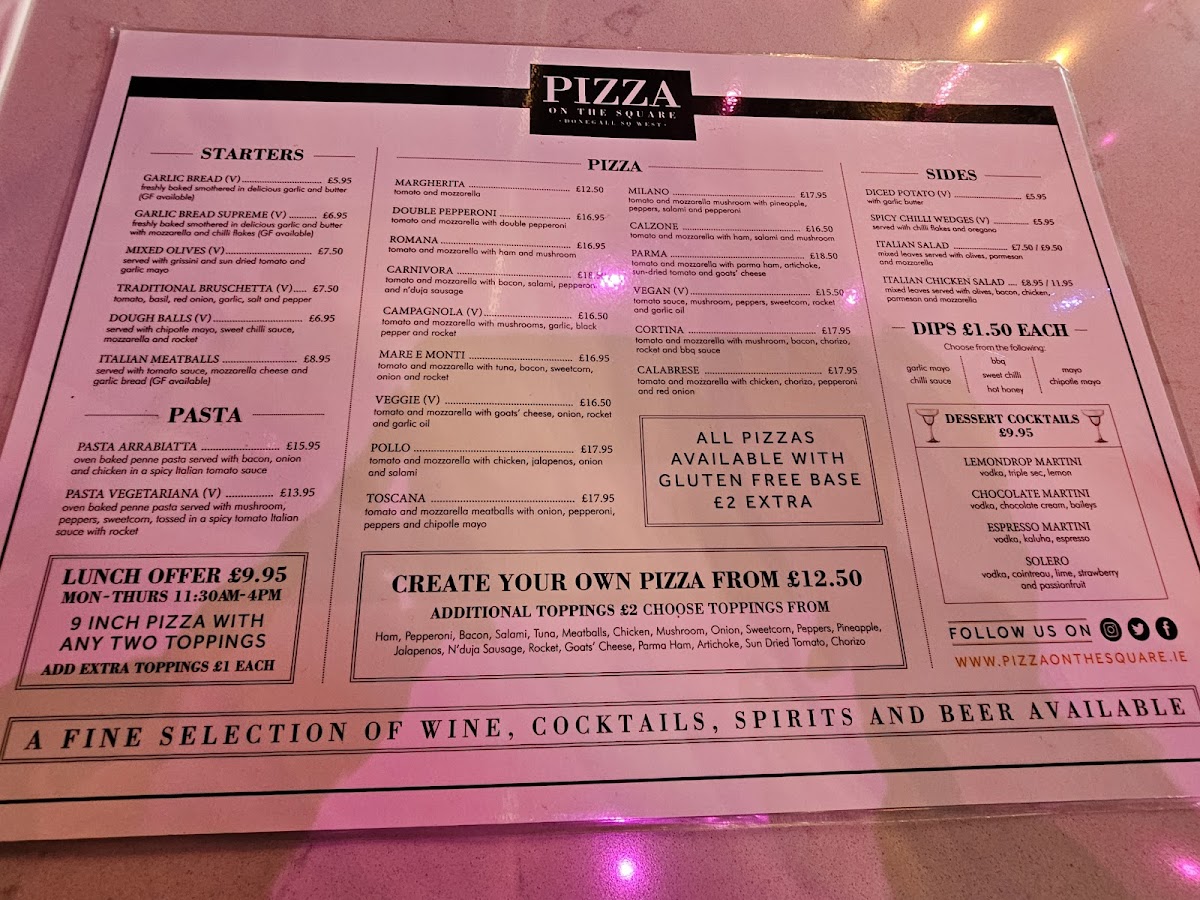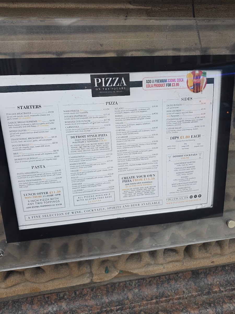 From a reviewer’s perspective, the menu at Pizza On The Square offers a well-rounded selection that balances classic Italian comfort with indulgent treats and drinks. Starters like Italian Meatballs, Garlic Bread Supreme, Mixed Olives, Traditional Bruschetta, and Dough Balls set a strong, familiar tone, while the pizza selection-Margherita, Milano, Double Pepperoni, Romana Con Funghi, and Carnivora-covers both traditional and meat-heavy options for different tastes. Sides such as Diced Potato, Skin On Fries, Italian Salad, and Caesar Salad complement the mains nicely, and pasta dishes like Pasta Arrabbiata and Pasta Vegetariana provide solid alternatives to pizza. The dessert and drinks menu stands out with items like Nutella Dough Balls, Chocolate Brownie, and cocktails including Lemondrop Martini, Chocolate Martini, Espresso Martini, and Strawberry Daiquiri, along with gins such as Bombay Sapphire, Shortcross, and Belfast Gin, making the overall menu feel varied, satisfying, and well-suited for both casual dining and a night out.