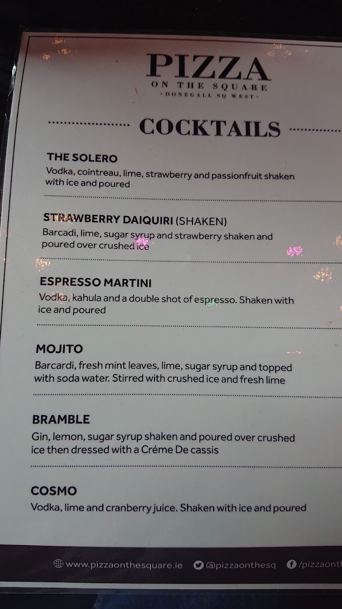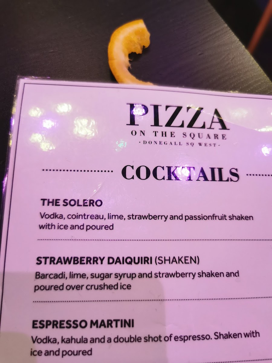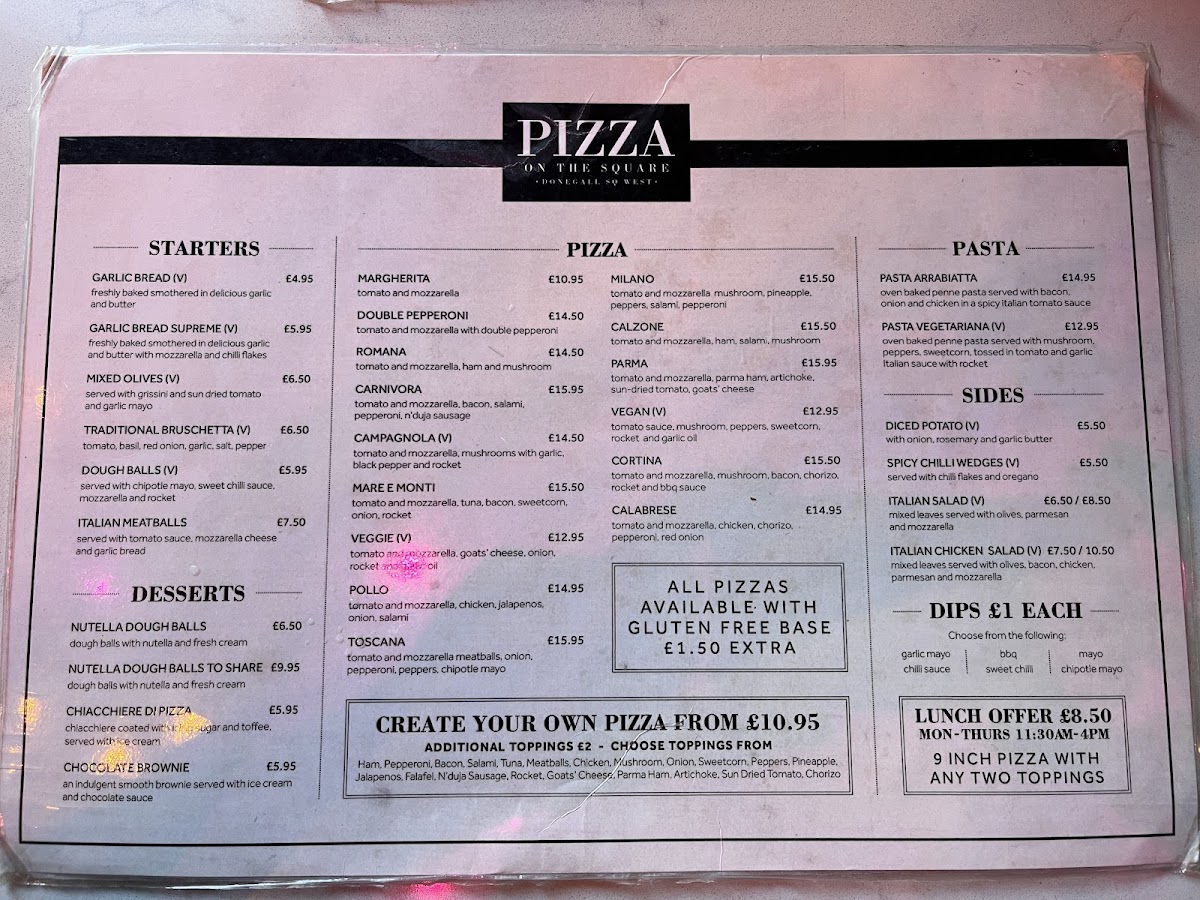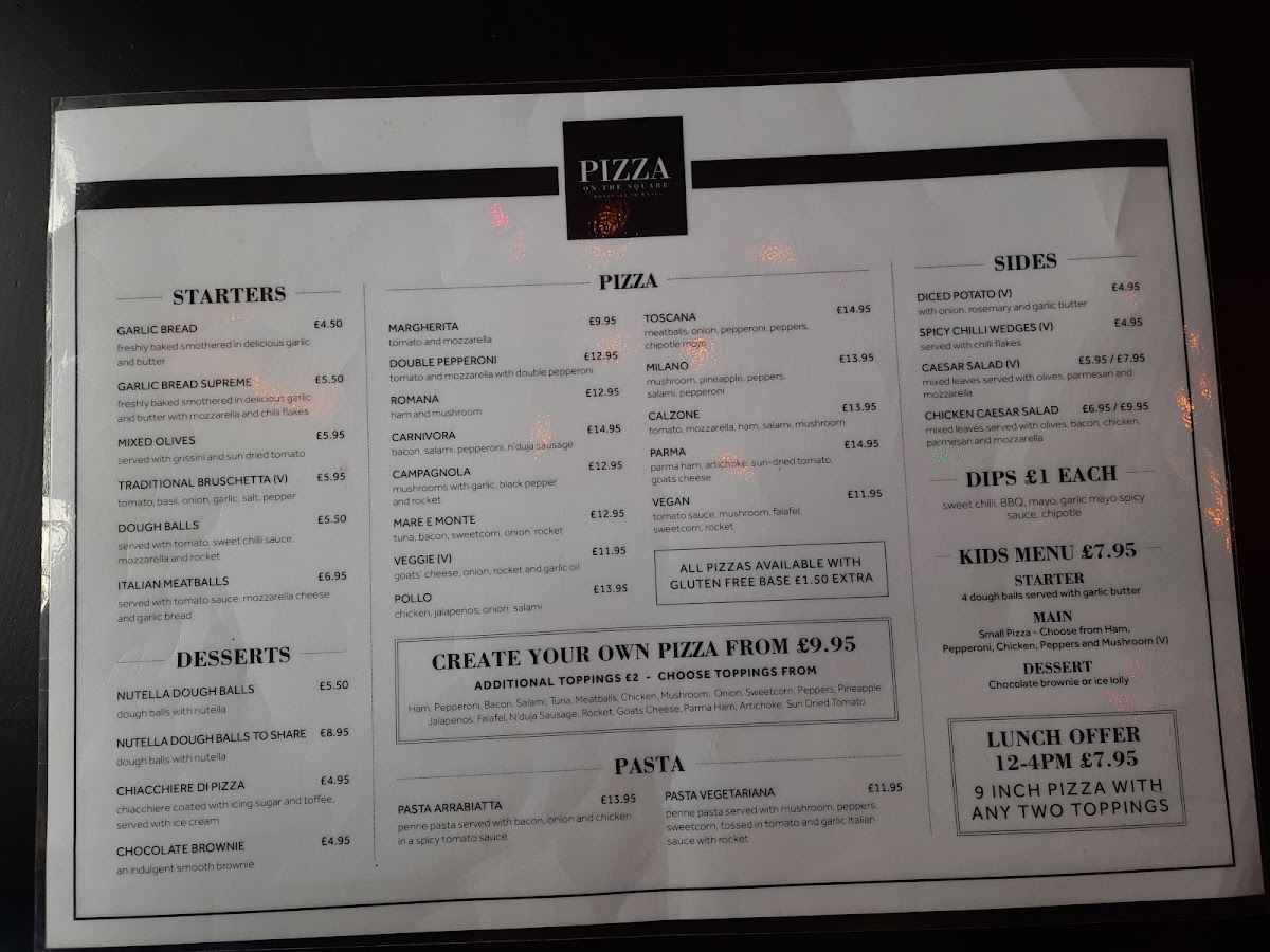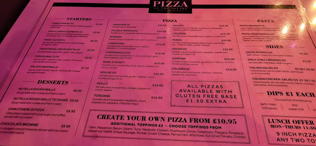 From a reviewer’s perspective, the menu at Pizza On The Square offers a well-rounded selection that balances classic Italian comfort with indulgent treats and drinks. Starters like Italian Meatballs, Garlic Bread Supreme, Mixed Olives, Traditional Bruschetta, and Dough Balls set a strong, familiar tone, while the pizza selection-Margherita, Milano, Double Pepperoni, Romana Con Funghi, and Carnivora-covers both traditional and meat-heavy options for different tastes. Sides such as Diced Potato, Skin On Fries, Italian Salad, and Caesar Salad complement the mains nicely, and pasta dishes like Pasta Arrabbiata and Pasta Vegetariana provide solid alternatives to pizza. The dessert and drinks menu stands out with items like Nutella Dough Balls, Chocolate Brownie, and cocktails including Lemondrop Martini, Chocolate Martini, Espresso Martini, and Strawberry Daiquiri, along with gins such as Bombay Sapphire, Shortcross, and Belfast Gin, making the overall menu feel varied, satisfying, and well-suited for both casual dining and a night out.